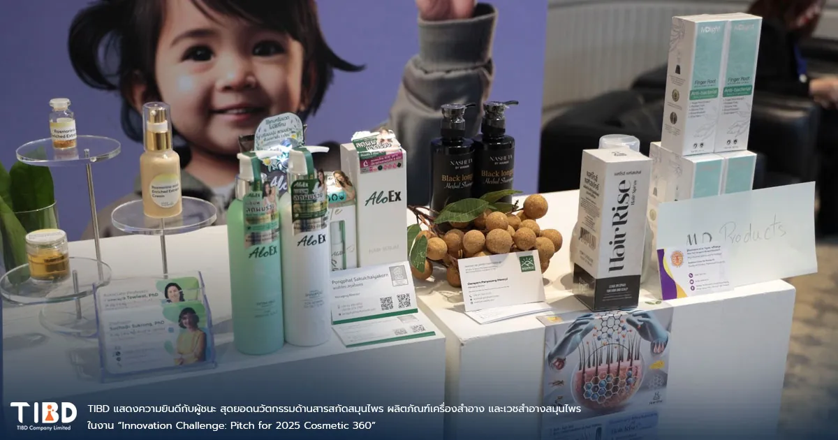 บริษัท ทีไอบีดี จำกัด (TIBD) ขอแสดงความยินดีกับผู้ชนะเลิศและผู้ประกอบการทั้ง 10 บริษัทที่ผ่านการคัดเลือกเข้าร่วมกิจกรรม Innovation Challenge: Pitch for 2025 Cosmetic 360 ภายใต้โครงการเชื่อมโยงธุรกิจนวัตกรรมเครื่องสำอาง สารสกัด และผลิตภัณฑ์สมุนไพรเพื่อการขยายตลาดทั้งในและต่างประเทศ (CIB2025) จัดโดยศูนย์ความเป็นเลิศด้านชีววิทยาศาสตร์ (องค์การมหาชน) หรือ TCELS ซึ่งจัดขึ้นเมื่อวันที่ 13 สิงหาคม 2568 ณ ห้อง MR205 ศูนย์การประชุมแห่งชาติสิริกิติ์ กรุงเทพมหานคร โดยมีรอบนำเสนอผลงานภาษาอังกฤษ 5 นาที และตอบคำถาม 10 นาทีต่อบริษัท ก่อนประกาศผลช่วงท้ายงาน เวลา 16.30–17.00 น.